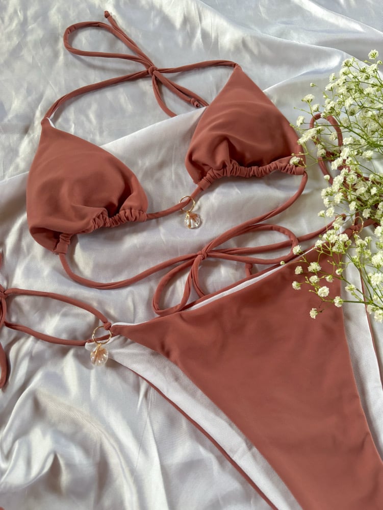 Brown 2 pc kini with shell charms, adjustable ties & cheeky coverage.